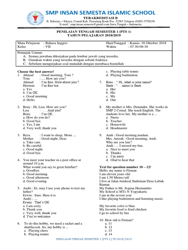 Semoga soal ini bisa bermanfaat untuk semua siswa dan pendidikan yang ada di indonesia. Soal uas bahasa inggris kelas x semester 2 read the following texts , then cross whether a, b, c, or d for the correct answer. Latihan soal uts pts bahasa indonesia kelas 7 semester 2 kurikulum 2013 beserta kunci jawaban. Kao has three different colors, they are white, brown, and black. Contoh soal pas bahasa inggris kelas 7 smp ini bisa digunakan sebagai contoh dalam pembuatan naskah soal seperti halnya artikel soal kami lainnya.